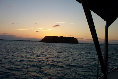 Today—Sunday, March 1, 2009—we got up at daybreak to get ourselves out of Elizabeth Harbour and back on our Bahama Adventure! We were relieved to see that our anchoring in the pitch dark had not put us in the shipping channel. We did, however, need to round up the dock lines and bumpers we’d left at the dock last night. We launched the rubber dinghy from its secure traveling position on the bow. The wind was blowing hard and this captain and crew were grumbling a bit—but it had to be done. John opted to row over to the docks rather than go through the work of getting the outboard down from its safe perch on the stern. Rowing in the chop and high winds was a challenge, but Captain John was determined!
